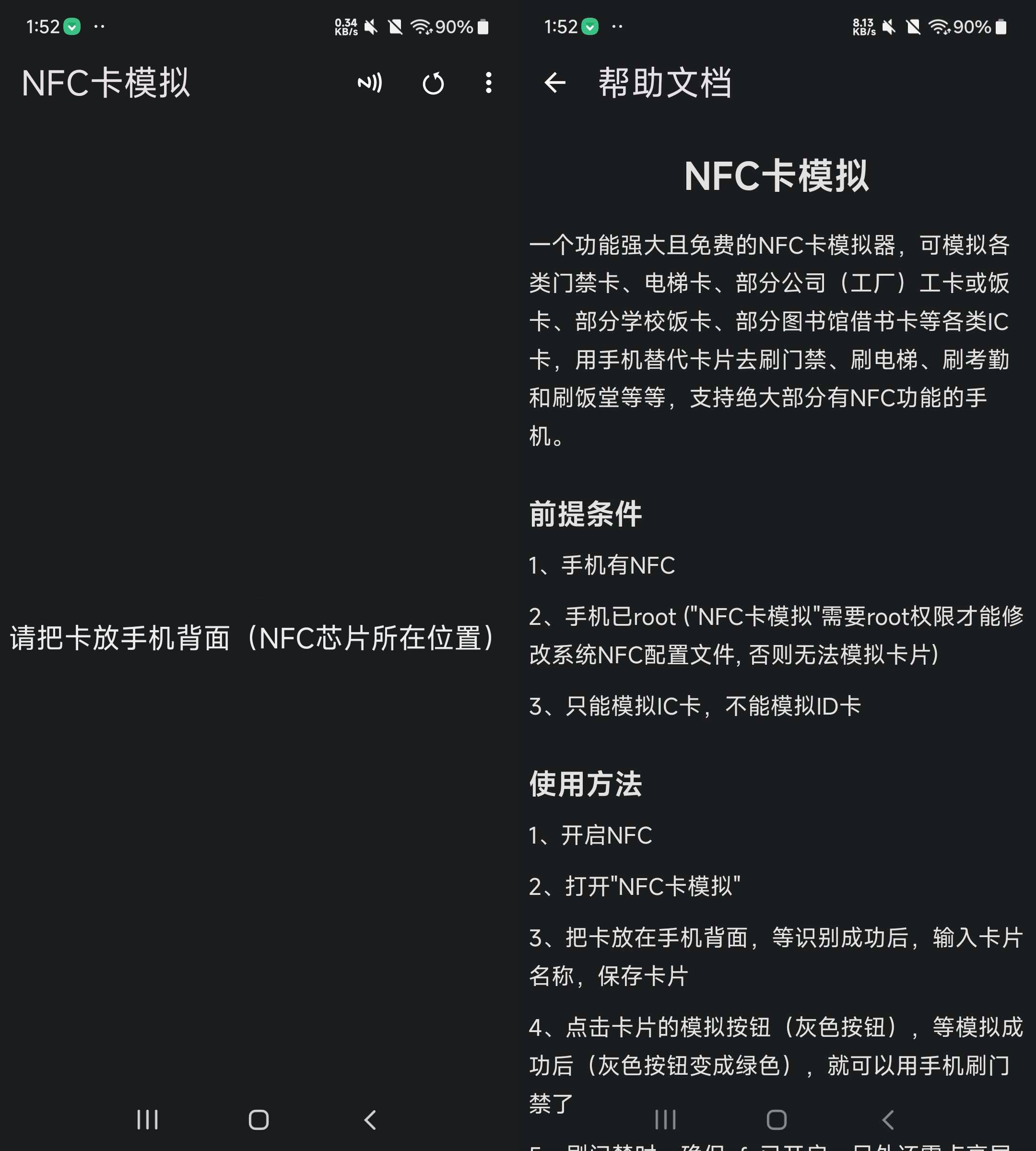 6、NFC卡模拟,可以快速模拟一张NFC卡片来作为门禁卡等卡片。